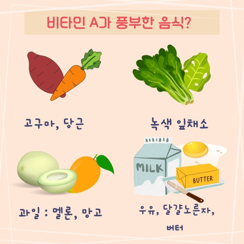 가장 널리 알려진 효능인 비타민A가 눈 건강에 도움이 된다는 사실은 다들 알고 계실 겁니다. 망막의 구성성분으로 눈의 시력을 보호하고 눈을 건강하게 유지하며 안과 질환이 없도록 돕습니다. 또한 실명의 주요 원인이 될 수 있는 황반변성을 예방하는 데에도 중요한 역할을 합니다. 비타민A가 체내에 부족하여 결핍되면 시력저하 등의 문제가 발생하며, 안구건조증, 야맹증 등이 발생할 가능성이 있어 어두운 곳에서 잘 보이지 않게 됩니다. 비타민 A의 또 다른 이점은 피부 관리에 도움이 된다는 것입니다. 피부와 점막을 형성하고 건강한 기능을 유지하는데 매우 필요합니다. 비타민 A가 부족하면 여드름이 쉽게 생기고, 피부와 머리카락이 칙칙해질 수 있습니다. 당신은 잃을 수 있습니다. 마지막으로 알려드릴 비타민A의 효능은 혈관벽을 두꺼워지게 하는 LDL콜레스테롤 수치를 감소시켜 고혈압, 고지혈증, 심장병 등 각종 심혈관 질환을 예방하는데 효과가 있다는 것입니다. 콜레스테롤 수치가 높아지면 합병증이 발생하고 동맥경화증 등 혈관질환이 발생한다. 가장 쉽게 발생하는 합병증의 일종이므로 적정 수준을 유지하는 것이 가장 좋습니다. 그렇다면 비타민 A가 많이 함유된 식품에는 어떤 것이 있을까요? 비타민 A가 많이 함유된 식품에는 1) 당근, 2) 토마토, 3) 들깨잎, 4) 시금치, 5) 곰뿌리, 6) 망고, 7) 피망 등이 있으며 동물의 간과 기타 식품도 있다. 계란에도 비타민A가 많이 들어있습니다. 주홍빛 당근이 대표적인 식품으로 잘 알려져 있습니다. 함량은 100g 기준 1,257μgRE 입니다. 다양한 영양소를 함유하고 있으며 독특한 맛과 색으로 인해 요리에 널리 사용됩니다. 생으로 먹는 것보다 기름에 살짝 튀겨 먹으면 흡수율이 더 높다고 합니다. 비타민A가 풍부한 식품인 토마토는 100g당 90μgRE를 함유하고 있습니다. 눈질환 개선 및 예방에 좋으며 피부미용에도 좋습니다. 뇌졸중과 심장 근육에도 좋습니다. 경색을 예방하고 혈당을 낮추며 암을 예방하는 데 도움이 됩니다. -치즈-100g당 비타민A 345ugRE를 함유하고 있습니다. 눈에 쌓인 피로를 효과적으로 풀어주고, 시력 저하를 예방해줍니다. 철분도 많이 함유되어 있어 빈혈 예방에도 탁월합니다. -시금치 – 100g당 비타민A 607ugRE. 시금치는 체내 유해물질을 원활하게 배출하는데 좋습니다. 섬유질이 풍부하여 변비에 좋고, 엽산도 함유되어 있습니다. 빈혈을 예방합니다. -계란 – 100g 기준 비타민A 87μgRE. 비타민A, 비타민D, 비타민E 등의 영양소가 풍부하고, 칼슘, 철분 등의 영양소도 다량 함유하고 있어 건강에 좋습니다. – 간 – 동물의 간 요리에도 비타민A가 풍부하다. 돼지간, 소간, 닭간 등에는 아연, 철, 인 등 미네랄이 풍부해 쇠고기 간을 섭취하면 면역체계, 신경계, 성장, 발달, 생식 건강. 또한 단백질이 풍부해 간세포 재생과 피로회복에 도움이 된다. 통증 완화에 좋다고 합니다. 다양한 음식과 비타민A의 효능에 대해 알아봤습니다. 다양한 음식을 통해 비타민A를 충전하시고 건강도 챙기시기 바랍니다!