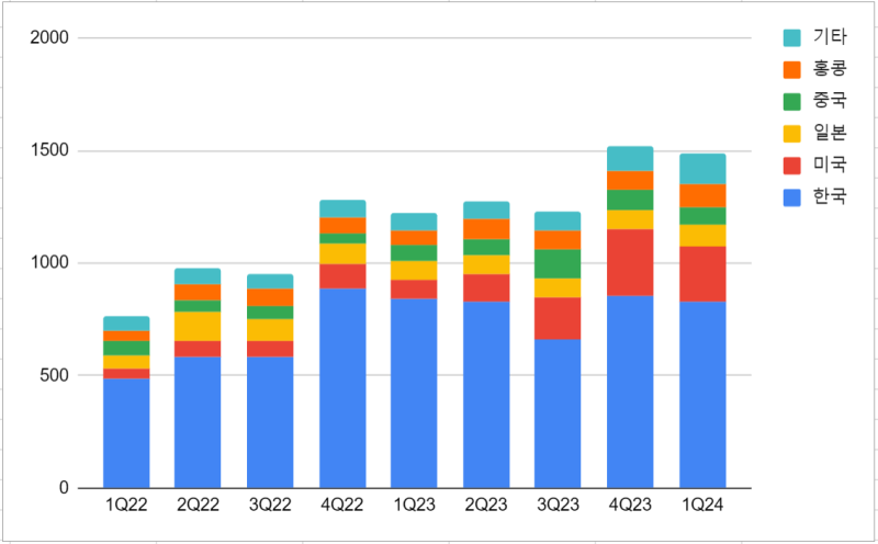 지역별 매출 동향을 살펴보겠습니다. 23년 4분기에는 23년 3분기 대비 매출이 증가했으며, 한국과 미국에서 전분기 대비 큰 폭의 성장을 보였습니다.