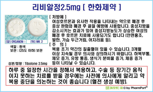 리비알정은 폐경기 여성의 다양한 호르몬 증상을 완화시키는 약이다. 이 약의 주성분인 티볼론은 여성호르몬인 에스트로겐, 프로게스테론, 남성호르몬인 안드로겐과 유사한 효과를 가지며 다양한 증상의 개선에 도움을 줄 수 있다. 호르몬 대체효과 : 체내에서 에스트로겐, 프로게스테론, 안드로겐과 같은 역할을 하며 각종 갱년기 증상을 완화시켜준다고 합니다. 폐경 후 나타나는 안면 홍조, 수면 장애, 기분 변화 등을 개선할 수 있다고 합니다. 복합 호르몬 조절: 티볼론은 신체 조직에 선택적으로 작용하기 때문에 다른 호르몬 대체 약물에 비해 부작용이 적다고 합니다. 특징적인 특징은 자궁 내막 증식 및 유방암 발병 위험을 줄일 수 있다는 것입니다. 폐경기 골다공증 예방 : 골다공증 예방에도 효과가 있다고 합니다. 골밀도가 떨어지는 경향이 있는 폐경기 여성에게 도움이 될 수 있습니다. 갱년기 증상 완화와 골다공증 예방에 도움을 줄 수 있는 호르몬 대체제이며, 다양한 호르몬 효과를 통해 부작용을 최소화한다고 합니다.